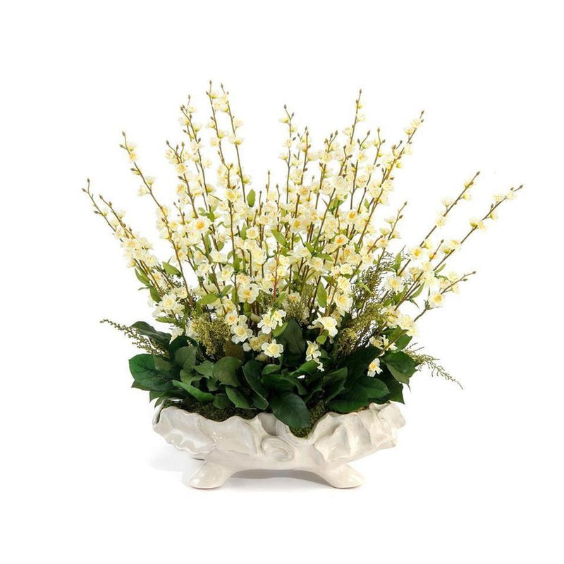 Footed, sculptured vase with a glazed finish filled with flowering branches and natural salal leaves & mood moss.