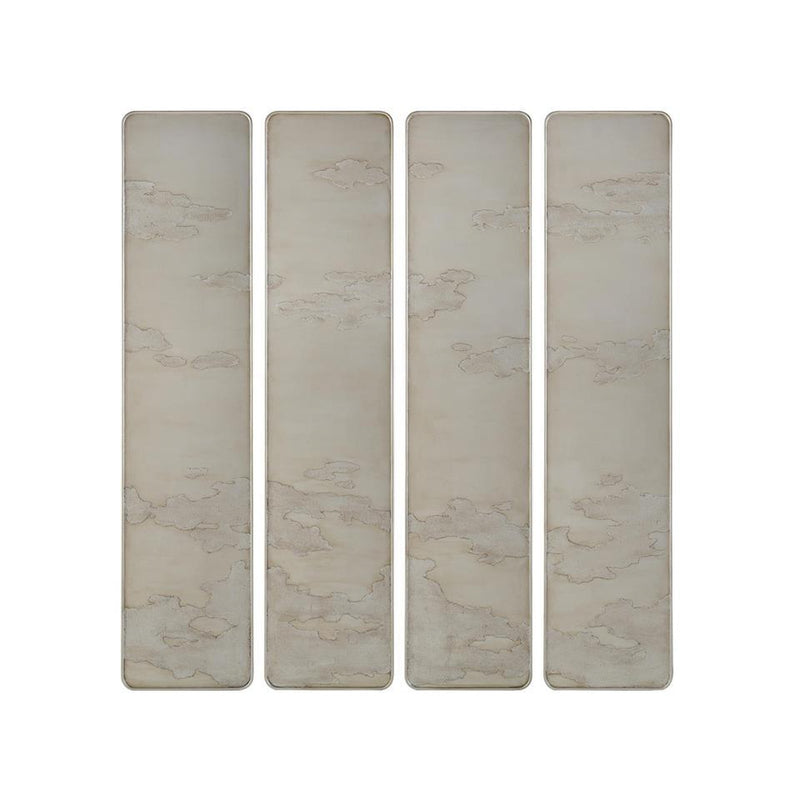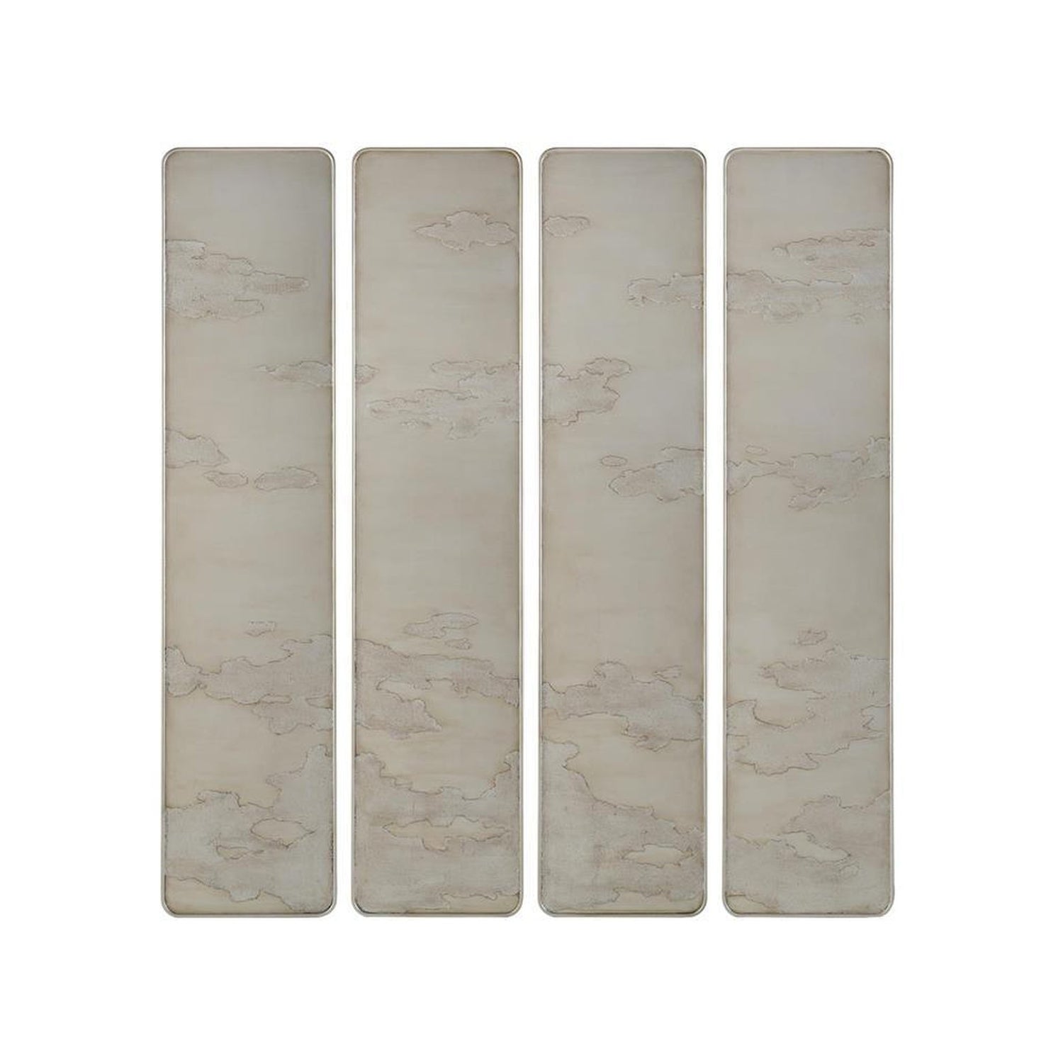 Finished in Truro silver leaf, the Audley wall panels feature a textured pattern that runs across the four panels, simulating wisps of clouds.