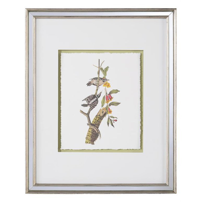 In this series, diminutive illustrations of beautifully colored birds are showcased within a thick, hand-painted mat and a mirrored frame.
