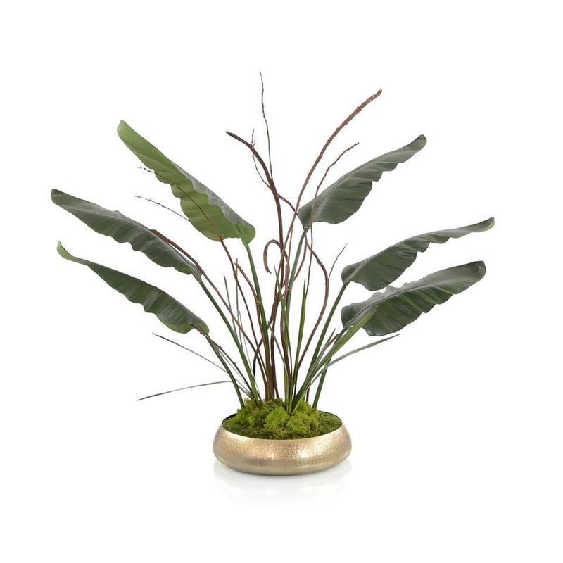 Towering bird-of-paradise, natural fantail willow, and amaryllis leaves are on a bed of natural preserved mood moss.