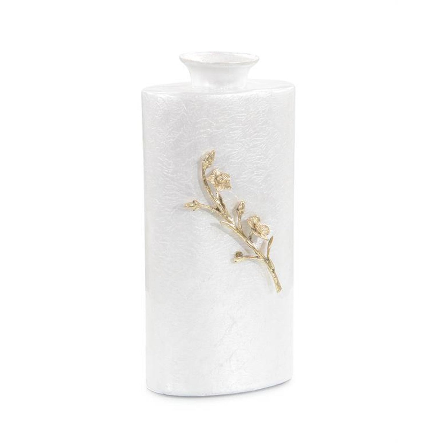 A beautiful hand-carved and cast brass flower adorns a white enameled vase.