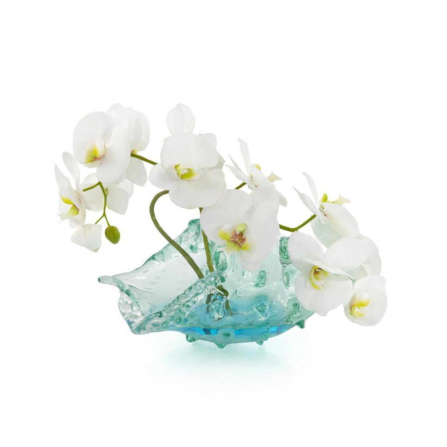 A seashell vase holds phalaenopsis orchids, natural white rolled marble, and faux water tinted turquoise.