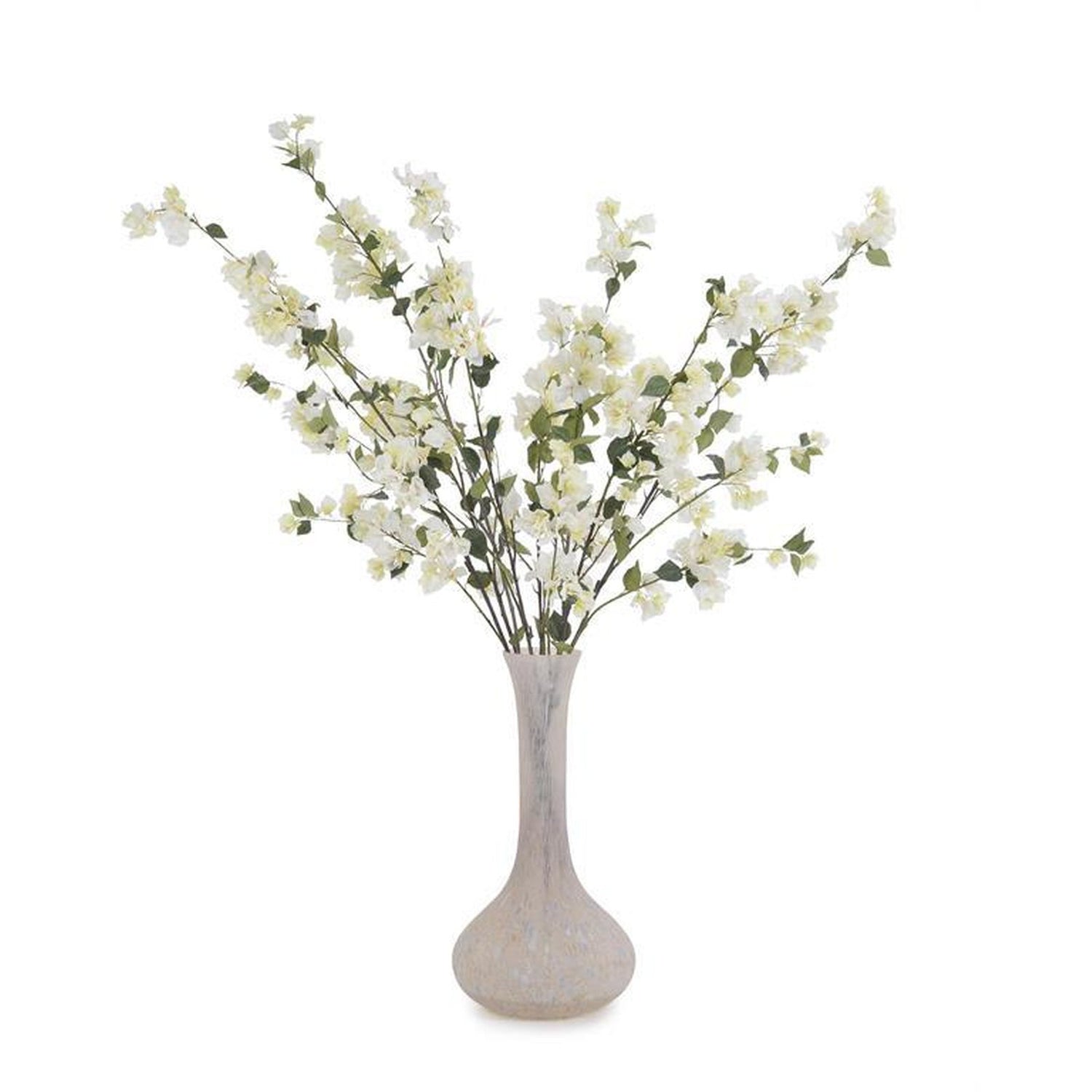 A pretty and pink vase is filled with towering bougainvillea blossoms and faux water.