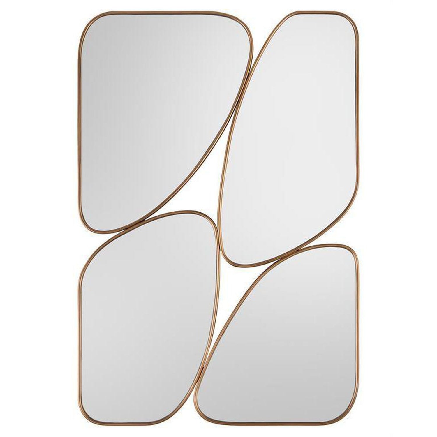 Four individual panes of modern mirror are each framed with a cockbead molding in Aztec gold and fused together to form a single mirror.