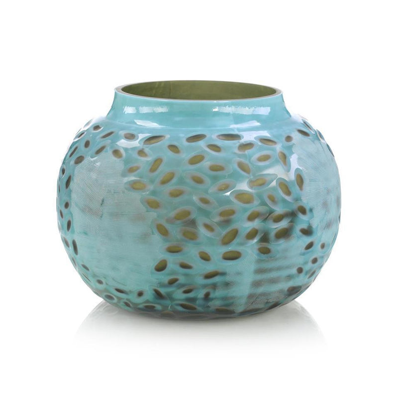 A striking glass jar in turquoise and emerald green has depth and dimension with hand-carved and engraved design work.