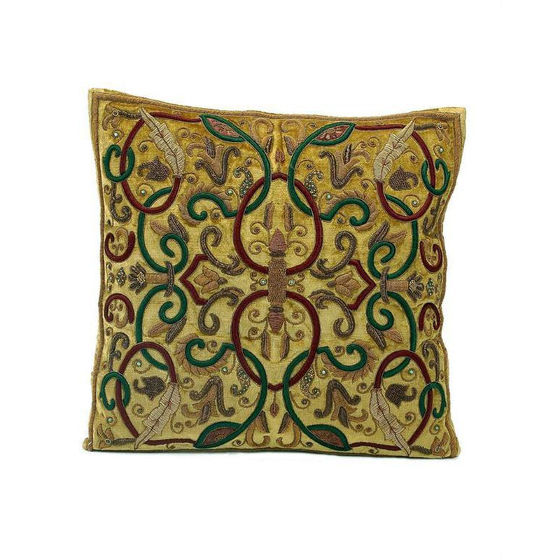 Antique Gold Velvet Pillow with heavily embroidered all over scroll designs in deep purple, dark green and copper metallic.