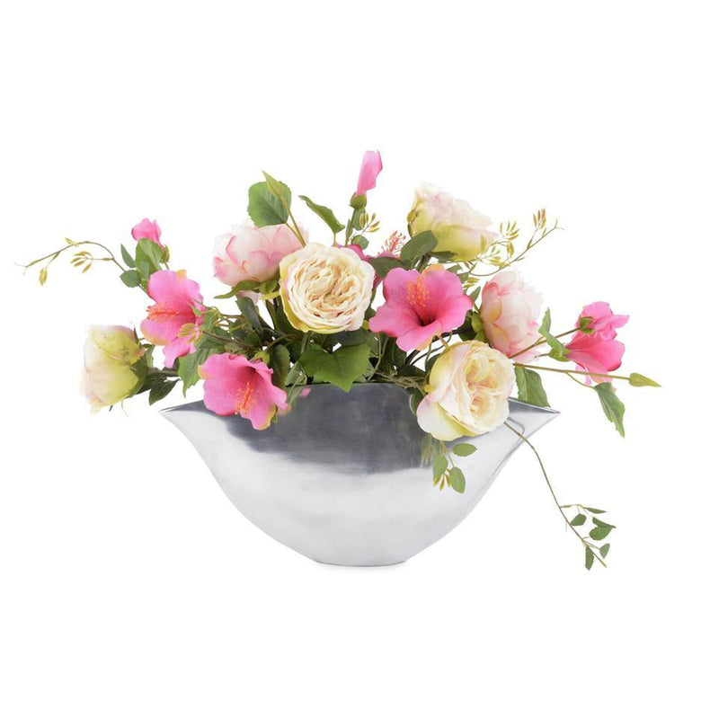 An eye-shaped vase in a chrome finish abounds with pink garden roses and hibiscus.