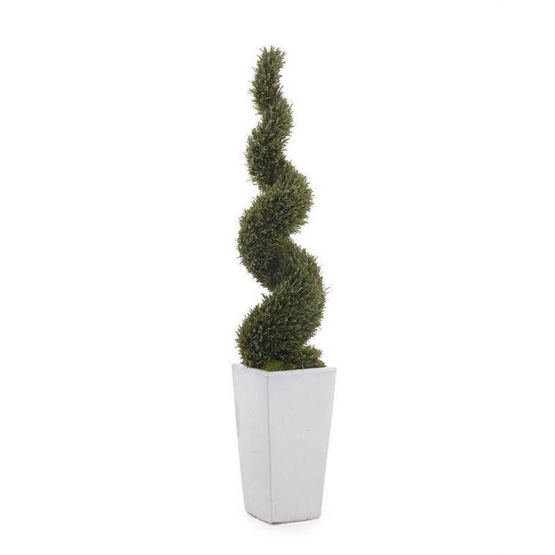 A spiral rosemary is in a glazed white ceramic planter with natural mood moss.
