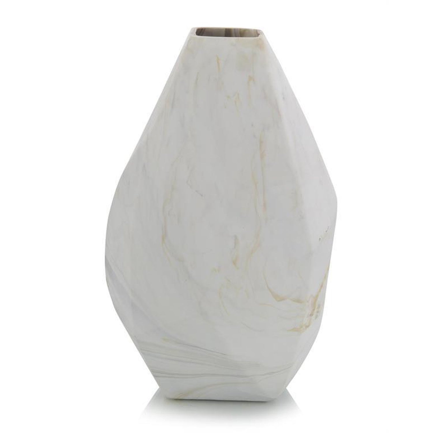 This slightly skewed, organic vase features wisps of smoke on white, matte glass.