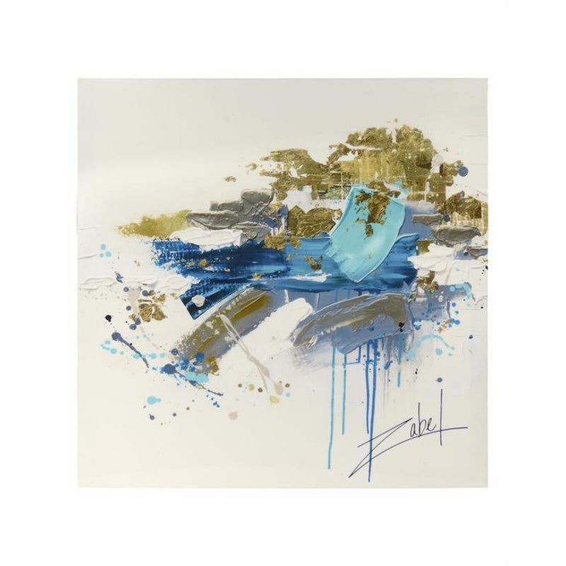In this dramatic abstract by artist Zabel, turquoise and golds dance across the high-gloss canvas.