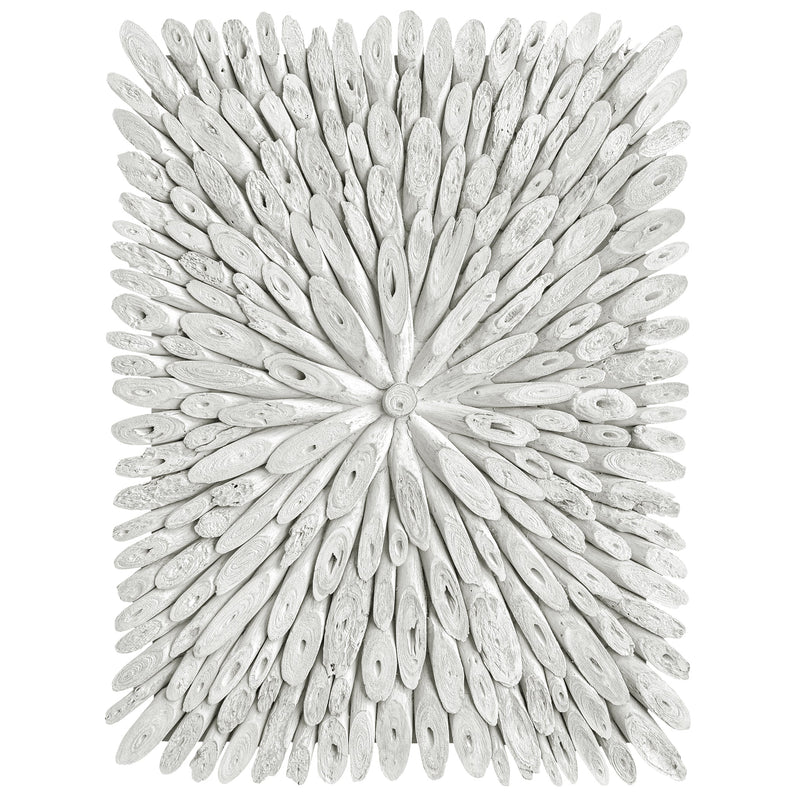 This Wood Wall Panel Is Handcrafted From Individually Cut Natural Driftwood Pieces In White Washed and Rustic Black Finish, Artfully Arranged In A Striking Sunburst Pattern.