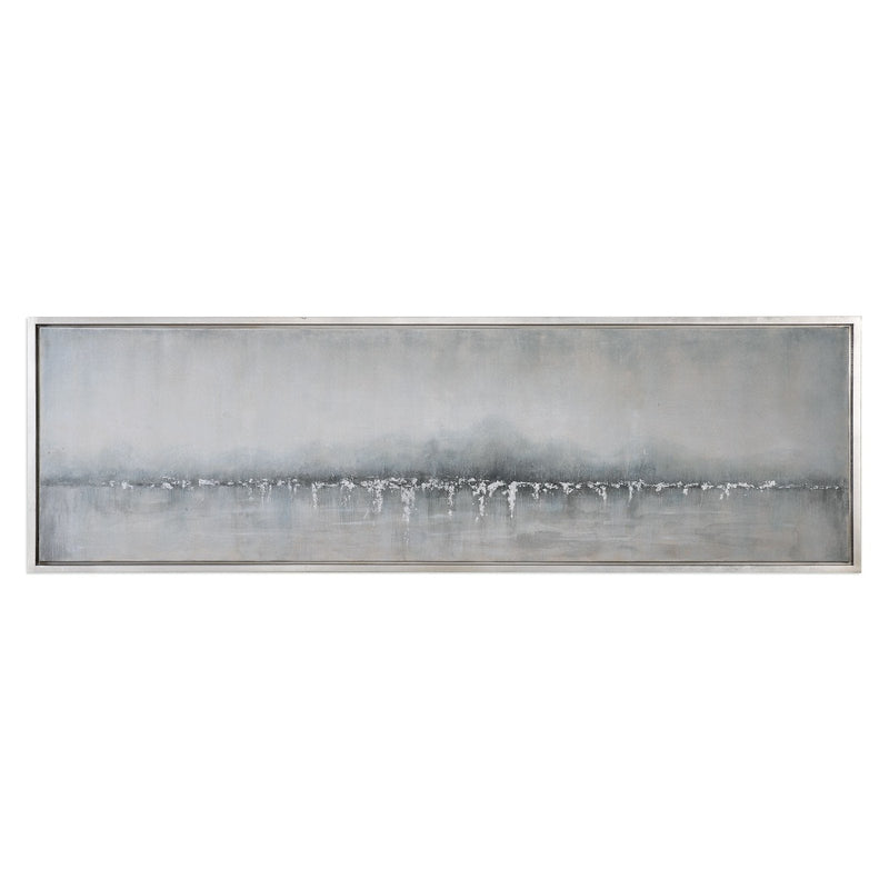The Canvas Is Stretched And Applied To Wooden Stretchers Before Being Encased By A Silver Leaf Gallery Frame.