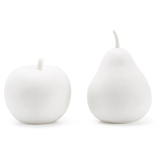 - Hand-molded with a white matte finish, our Apple and Pear set add some fruity freshness to a kitchen tabletop or dining room sideboard with a hint of pastiche—like a traditional still life turned three dimensional.